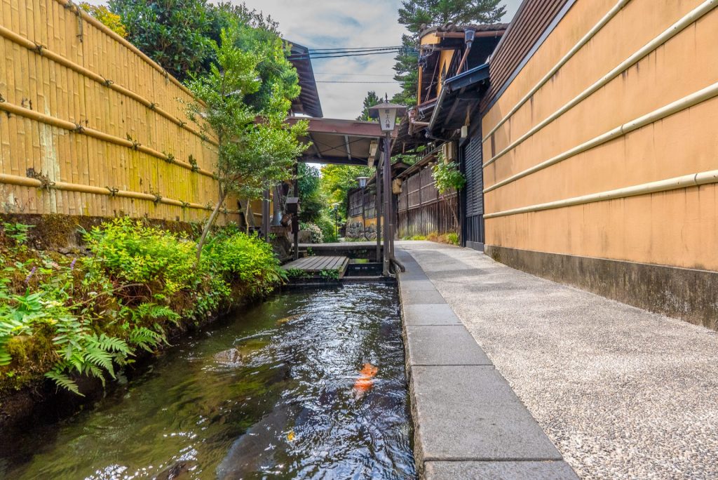 - 細い路地を歩けば、せせらぎと石畳の音が心地よく響く。