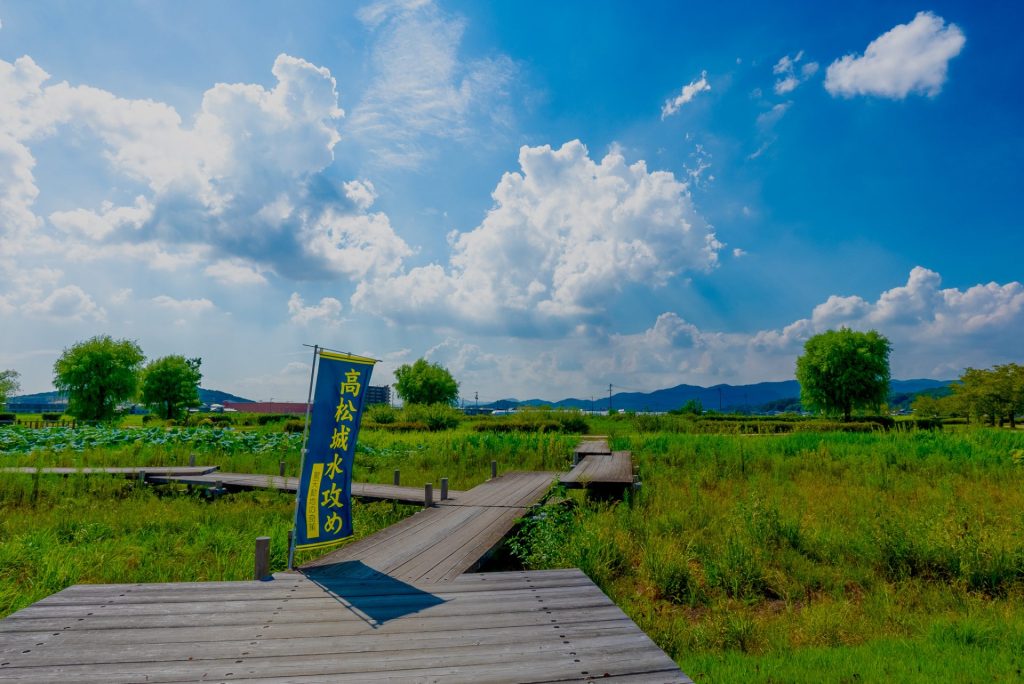 水攻めの跡地には蓮が咲き、穏やかな風景が広がっている。